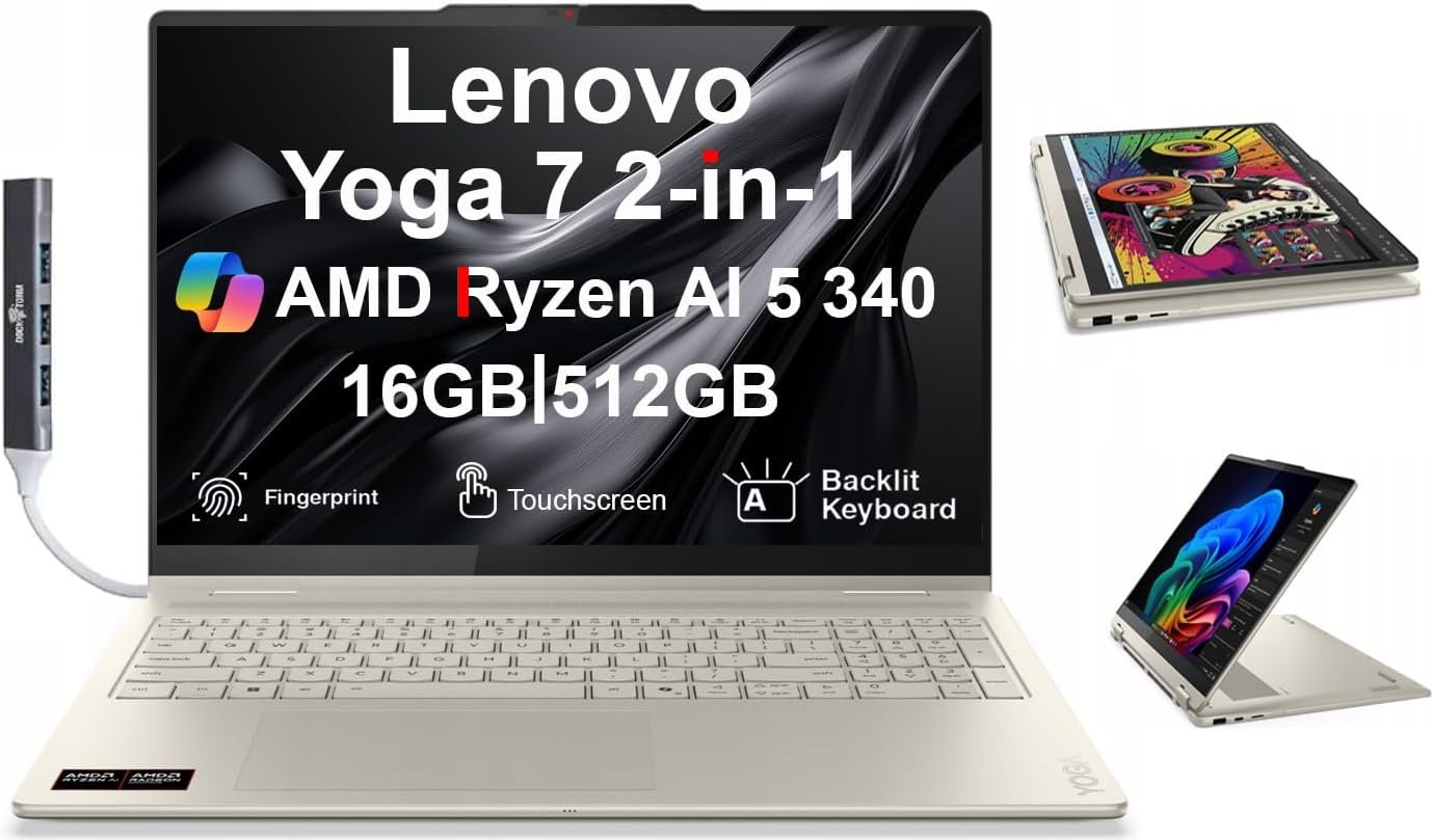 Configuration We offer all of the following configurations, if you cannot find the correct listing please check for other listings on our Store page. Model Name Lenovo Yoga 7 2-in-1 Form/Color 2-in-1 Convertible/Seashell Color Display 16.0″ IPS WUXGA (1920×1200) 16:10 Touchscreen Display RAM 16GB OnBoard LPDDR5X RAM Hard Drive Customizable Storage: 512GB PCIe SSD, 1TB PCIe SSD, 2TB PCIe SSD (Solid State Drive) Operating System Window 11 Professional (Win 11 Pro-64), Window 11 Home-64 Processor AMD Ryzen AI 5 340 (NPU Up to 50 TOPS) 2.00GHz Processor (Zen 5 Gen, upto 4.8 GHz, 16MB Cache, 6-Cores, 12-Threads) Graphics Card AMD Radeon 840M Shared Integrated Graphics Connectivity WiFi 7, Bluetooth 5.4 Ports/Slots 1 x USB 3.0 (Type-A), 2 x USB 3.1 (Type-C), 1 x Micro SD Reader, 1 x HDMI and Headphone/Microphone Combo Jack Other Features Fingerprint, White Backlit Standard Keyboard, Webcam, AI Copilot Battery 65W PSU, Type-C Power-In, USB-C Power Adapter, 4-Cell 70 WHr Battery Product Dimensions 10.11 IN x 14.0 IN x 0.75 IN Weight 4.3 lb Includes Authorized Dockztorm Portable USB Hub(Special Edition Portable Dockztorm Data Hub;Super Speedy Data Sync Rate upto 5Gbps)