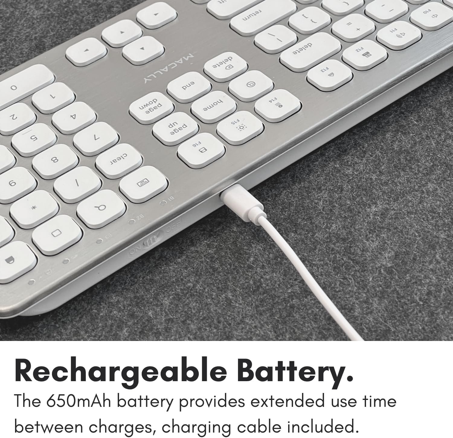 Rechargeable Mac Wireless Keyboard: Built-in 650mAh rechargeable Lithium-ion battery lasts up to 2 months with no need to replace battery and can recharged with the included USB cable.