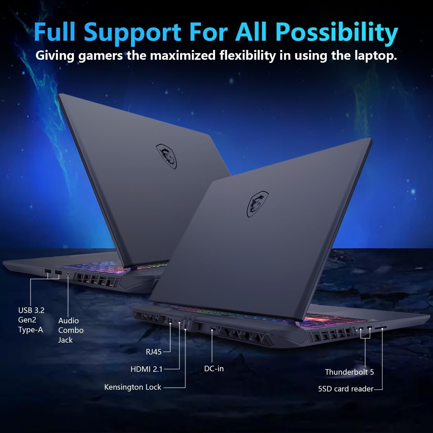 [Comprehensive Connectivity Options] Includes 2x Thunderbolt 5 Type-C, 2x USB 3.2 Gen 2 Type-A, 1x RJ45 LAN, 1 x Headphone/Microphone Combo Jack, 1 x DC in, 1x HDMI 2.1, 1x SD Card Reader, 720p HD Camera, RGB Backlit Keyboard, Wi-Fi 6 and Bluetooth for versatile and high-speed connections to various devices and networks