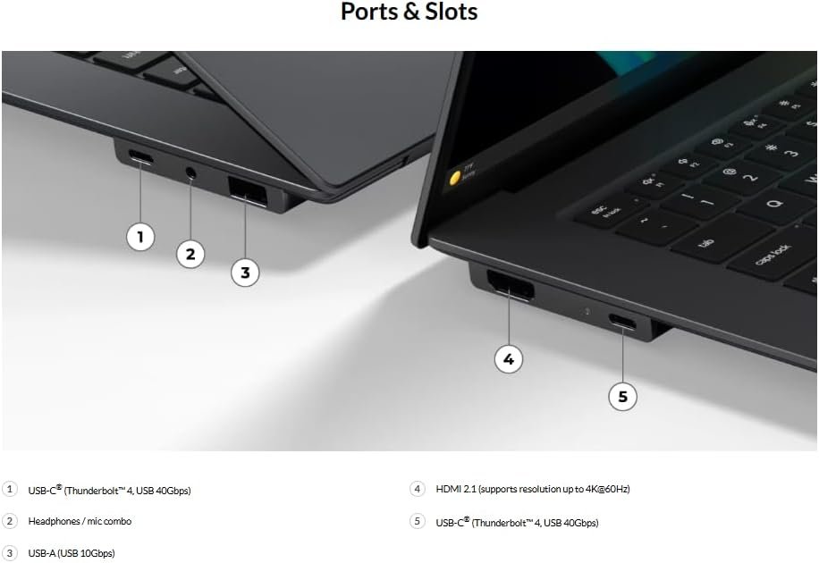 Ports&Slots: 2 x USB-C (Thunderbolt 4, USB 40Gbps), USB-A (USB 10Gbps), Headphones / mic combo, HDMI 2.1 (supports resolution up to 4K@60Hz)