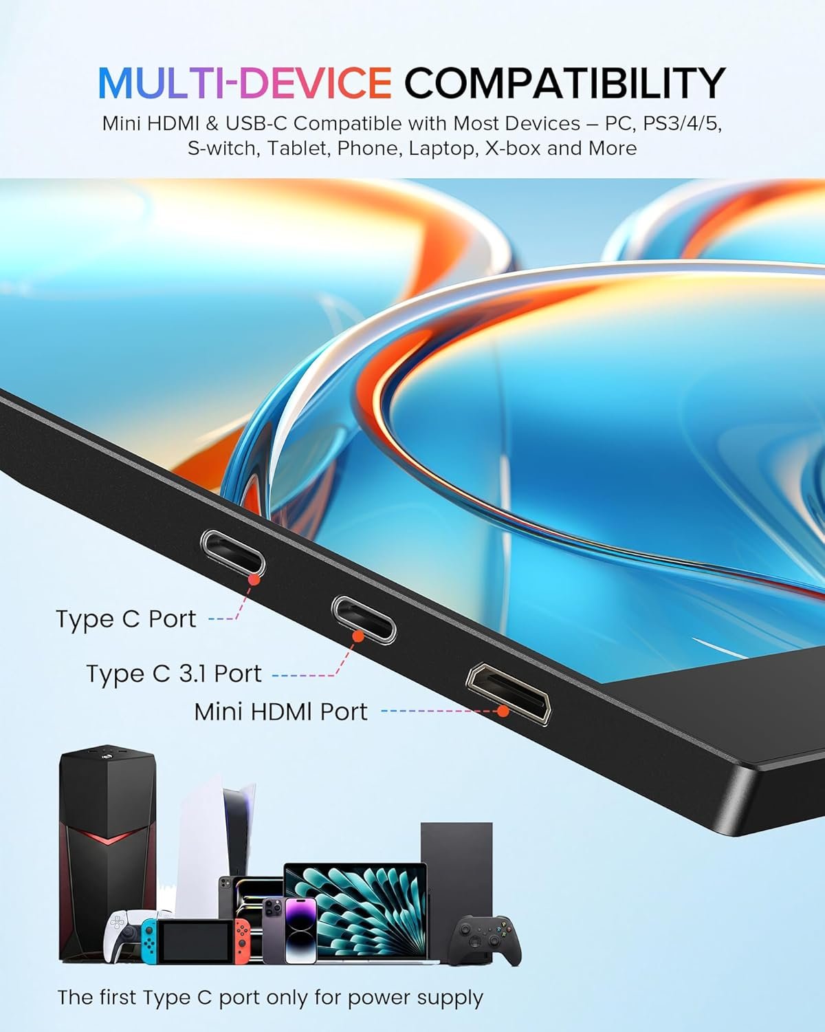 【Plug & Play, Strong Compatibility】: Portable laptop monitor just connects device with corresponding cable, be turned on and used in seconds. Laptop monitor is equipped with full-function mainstream interfaces such as USB-C and HDMI, and can be seamlessly adapted to laptops (Windows/macOS systems), smart phones (Android /iOS), tablets, and game consoles (Swit-ch/PS-4/5/X-box, Steam-deck)