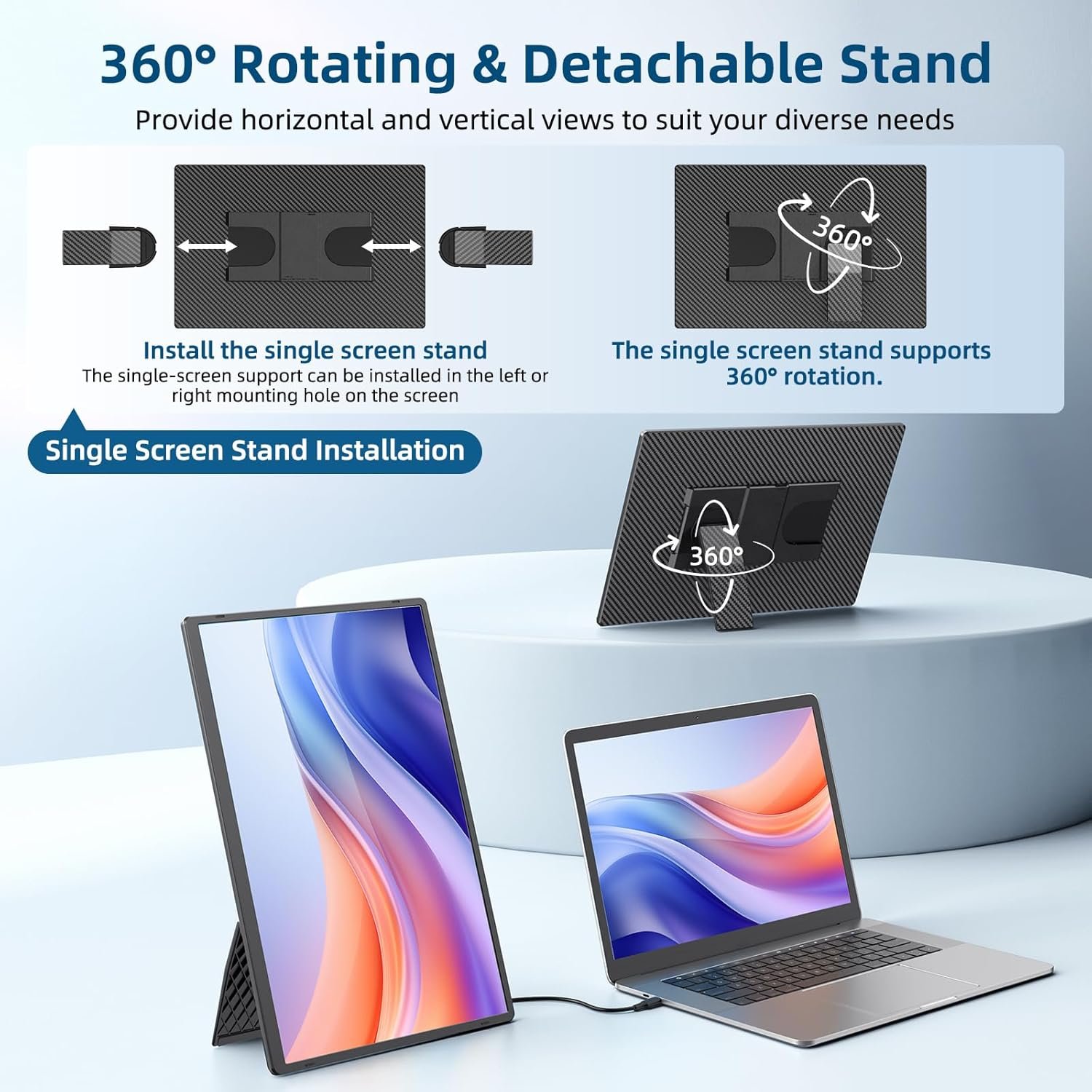 【360° Rotating Detachable Stand】This travel monitor for laptop comes with a 360° rotatable and detachable small stand, iberates your workflow, allowing you to adjust the angle freely and seamlessly switch between landscape and portrait modes, This portable laptop monitor is easy to carry, easy to work. Perfect for skimming lengthy contracts vertically or comparing spreadsheets side-by-side horizontally, all without fumbling with clunky hardware.