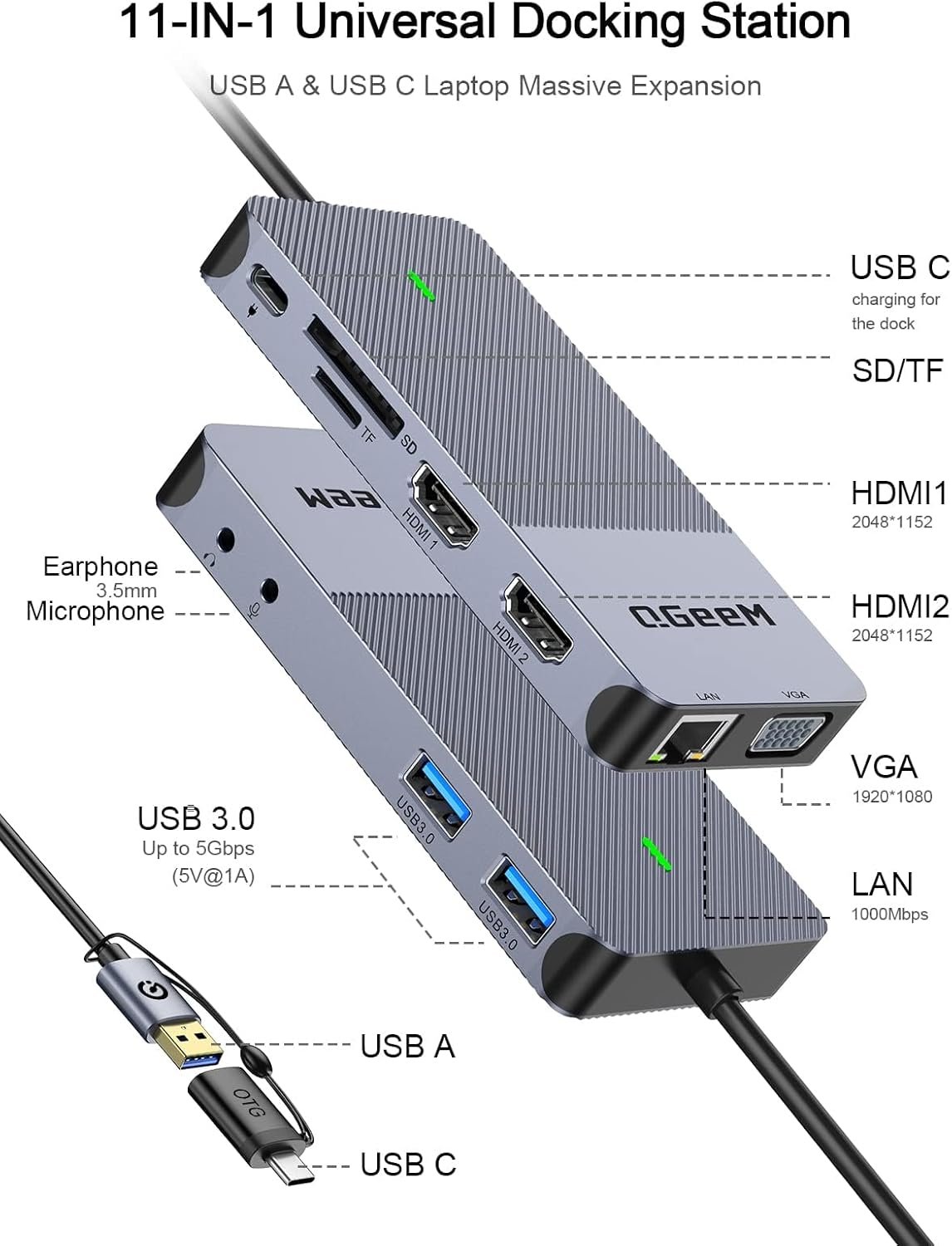 QGeeM USB docking station provides additional USB ports, video outputs (such as HDMI or VGA), audio jacks, Ethernet ports, and SD/TF Card Port. This enables you to connect multiple devices and peripherals to your computer simultaneously.