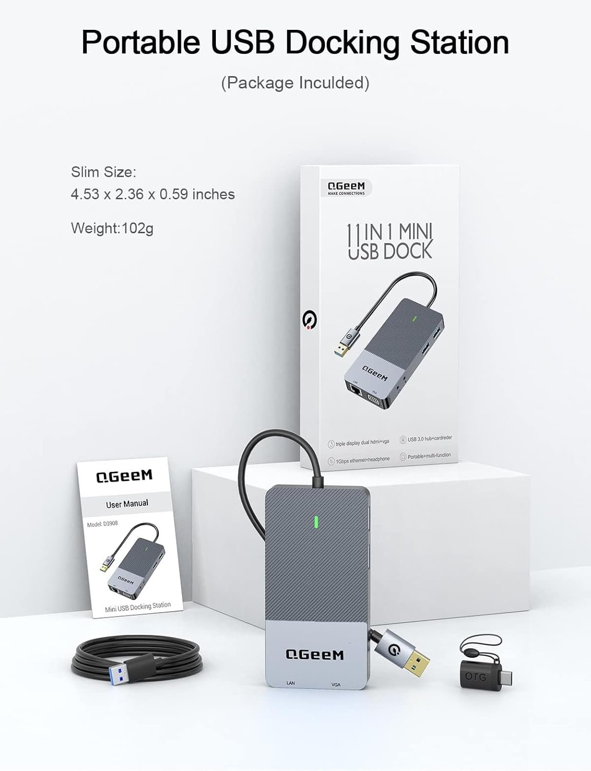 [What You Get]: QGeeM USB Docking Station, USB A to C cable, USB-C converter adapter, User Manual (Note: If you have any issues, please do not hesitate to contact us for a pleasant solution, we provide 18-month warranty, and 24h friendly customer service, Thanks for your trust)