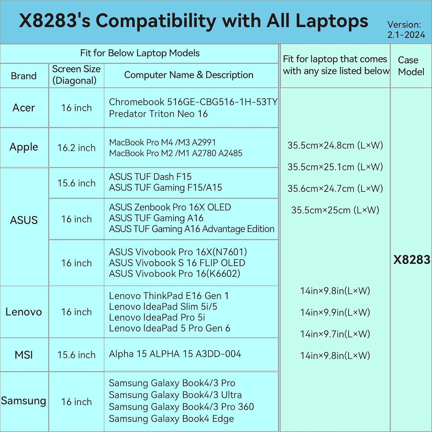 Model No.: X8283: internal dimensions of the case: 36.2x 25.2x 2.7 cm ( 14.3x 9.9x 1.1 inch ).Recommend Laptop Size: 35.6x 25.1x 2.2 cm. Please confirm your laptop dimension. If the size of your laptop exceeds our recommended dimensions on any side, this sleeve will not fit your laptop