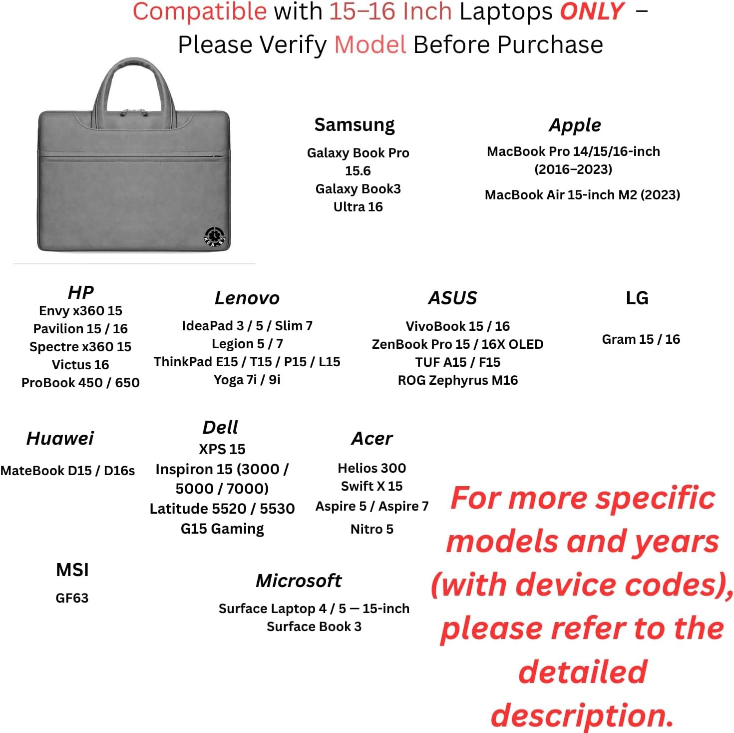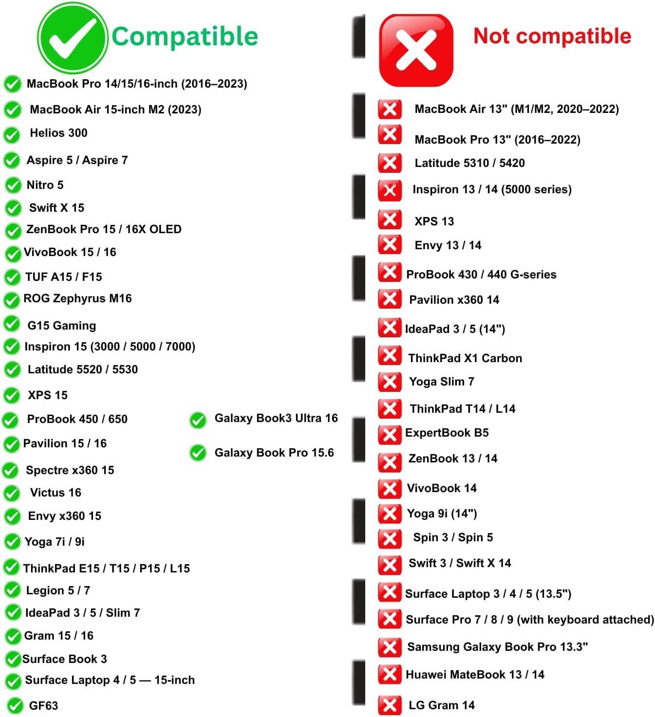 Compatible with the following devices : Lenovo: IdeaPad 3/5/Slim 7, Legion 5/7, ThinkPad E15/T15/P15/L15, Yoga 7i/9i ASUS: VivoBook 15/16, ZenBook Pro 15/16X OLED, TUF A15/F15, ROG Zephyrus M16 Acer: Aspire 5/7, Nitro 5, Helios 300, Swift X 15 Microsoft: Surface Laptop 4/5 15 inch, Surface Book 3 Samsung: Galaxy Book Pro 15.6, Galaxy Book3 Ultra 16 Other: MSI GF63, Huawei MateBook D15/16s, LG Gram 15/16