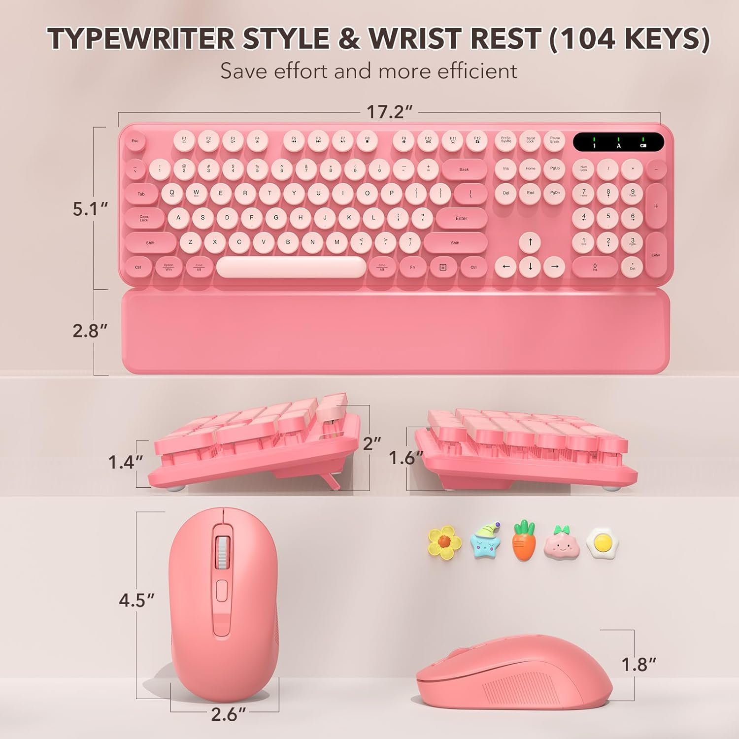 Detachable Magnetic Wrist Rest – 54% More Support: The ergonomic magnetic wrist rest provides up to 54% more palm support to help reduce wrist strain during long study or work sessions. It attaches magnetically in seconds, stays firmly in place, and features a splash-resistant surface that is easy to wipe clean, keeping your baby pink keyboard looking fresh.