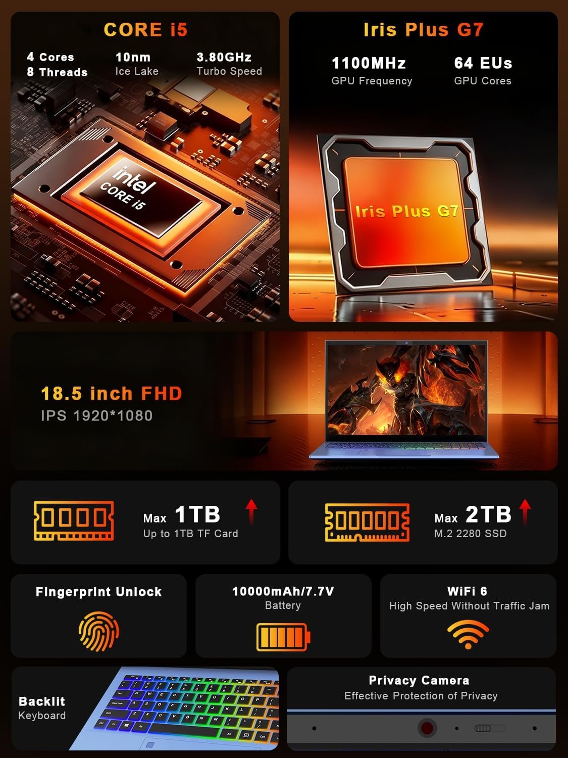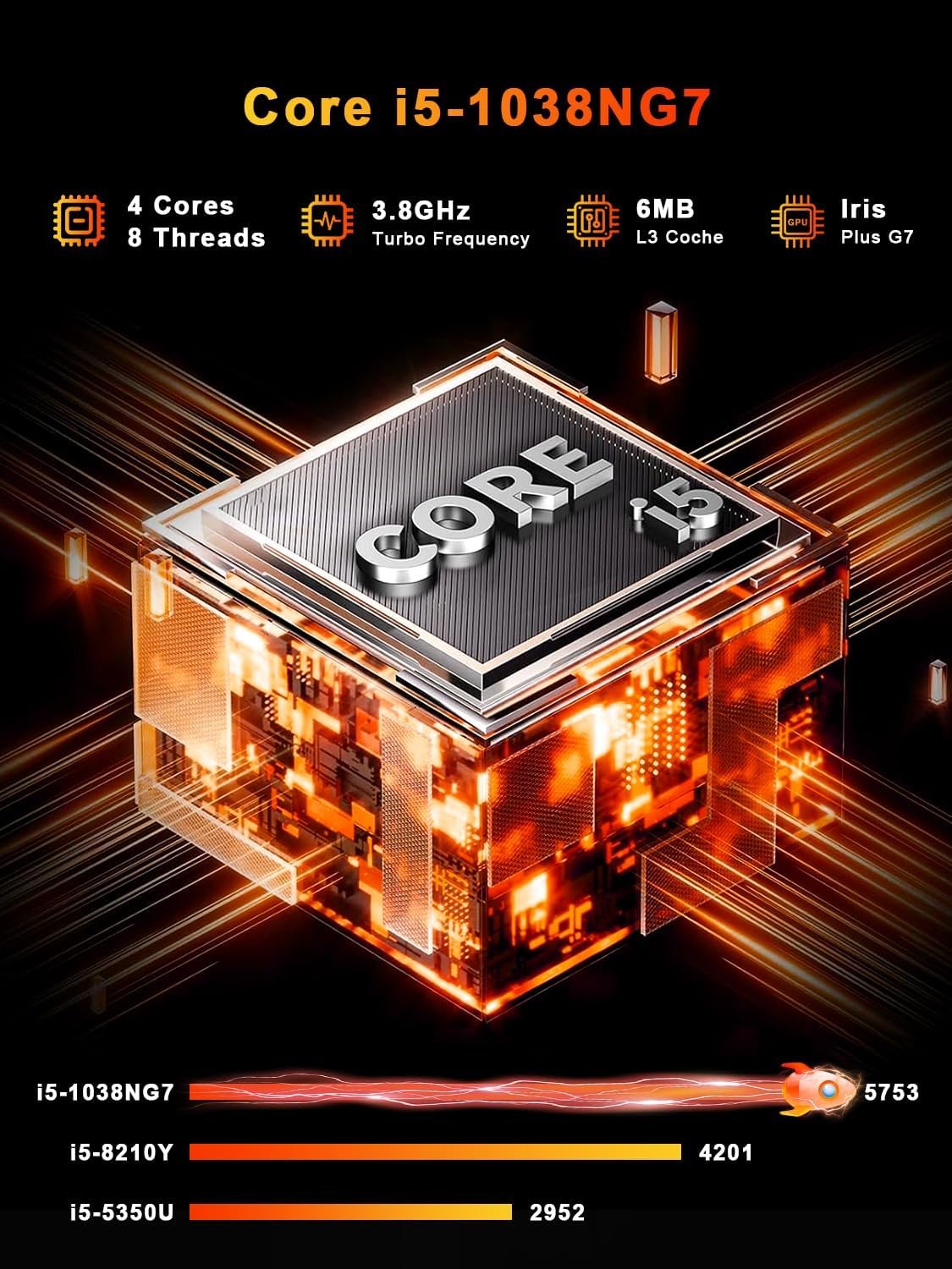 Performance: I5 processor (4C/8T, 2.0-3.8 GHz) paired with lris Plus G7 Graphics(Turbo at 1050MHz) and excellent power efficiency management; Win11 Pro preinstalled; Ideal for smooth multitasking with 10+ browser tabs + 3+ work/study apps, runs light games like Fortnite (low settings) at 30+ FPS, and handles 1080P basic editing/casual design plus smooth 4K video playback.